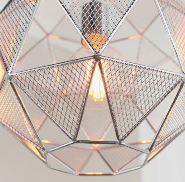 The Armoura pendant is on trend with its geometric, angular design and chrome effect finish. Formed from a collection of mesh triangles, the cut outs create a fabulous light effect. Dimmable and compatible with LED lamps. Also available in a copper plate.