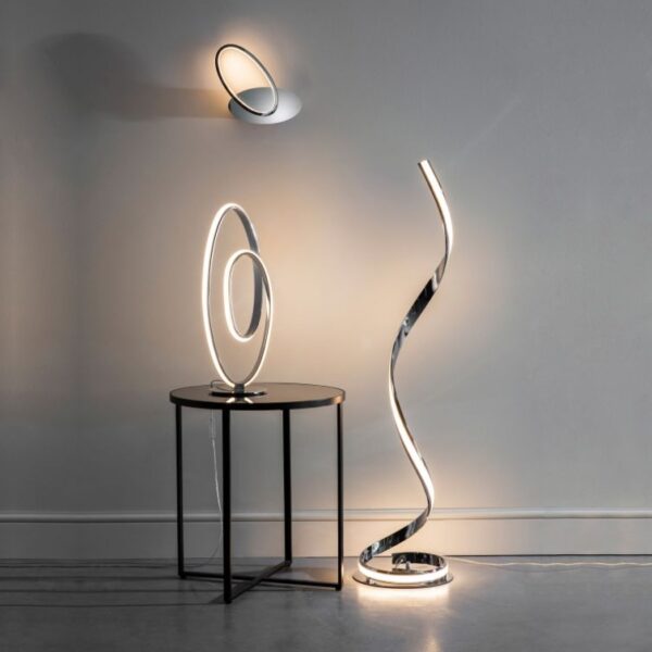 A unique contemporary floor lamp with flowing illuminated curves, a perfect addition to today’s modern interiors. Chrome plated finish with white diffuser and Integrated LED.